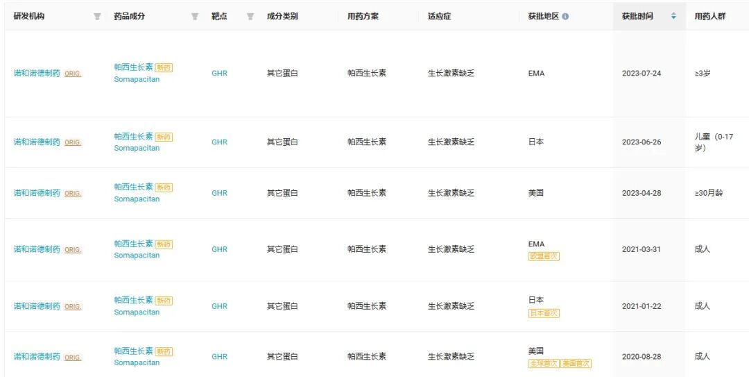 此前,帕西生长激素已在美国、欧盟、日本等海外国家和地区获批,用于治疗儿童和成人的生长激素缺乏症。在国内,2024 年 9 月,帕西生长激素的首个适应症上市申请(注册分类为 3.1)已获得 CDE 受理,推测用于治疗儿童生长激素缺乏症。