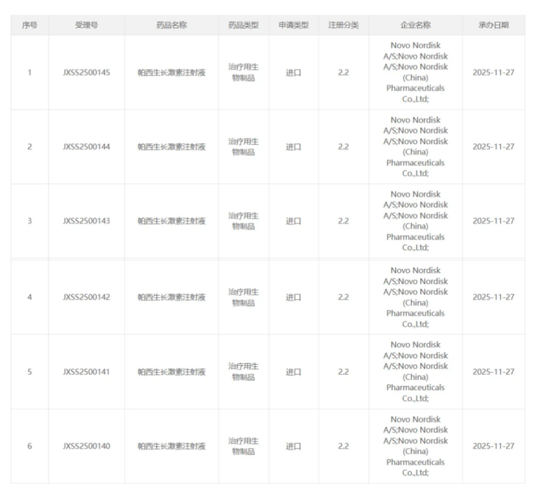 11 月 27 日,CDE 官网显示,诺和诺德的帕西生长激素注射液又一适应症的上市申请获得受理。根据该药的临床研究进度和本次的注册分类,根据 Insight 数据库,此次申报的适应症可能为:治疗因出生时为小于胎龄儿或特发性身材矮小或 Turner 综合征或 Noonan 综合征所致的儿童矮身材。
