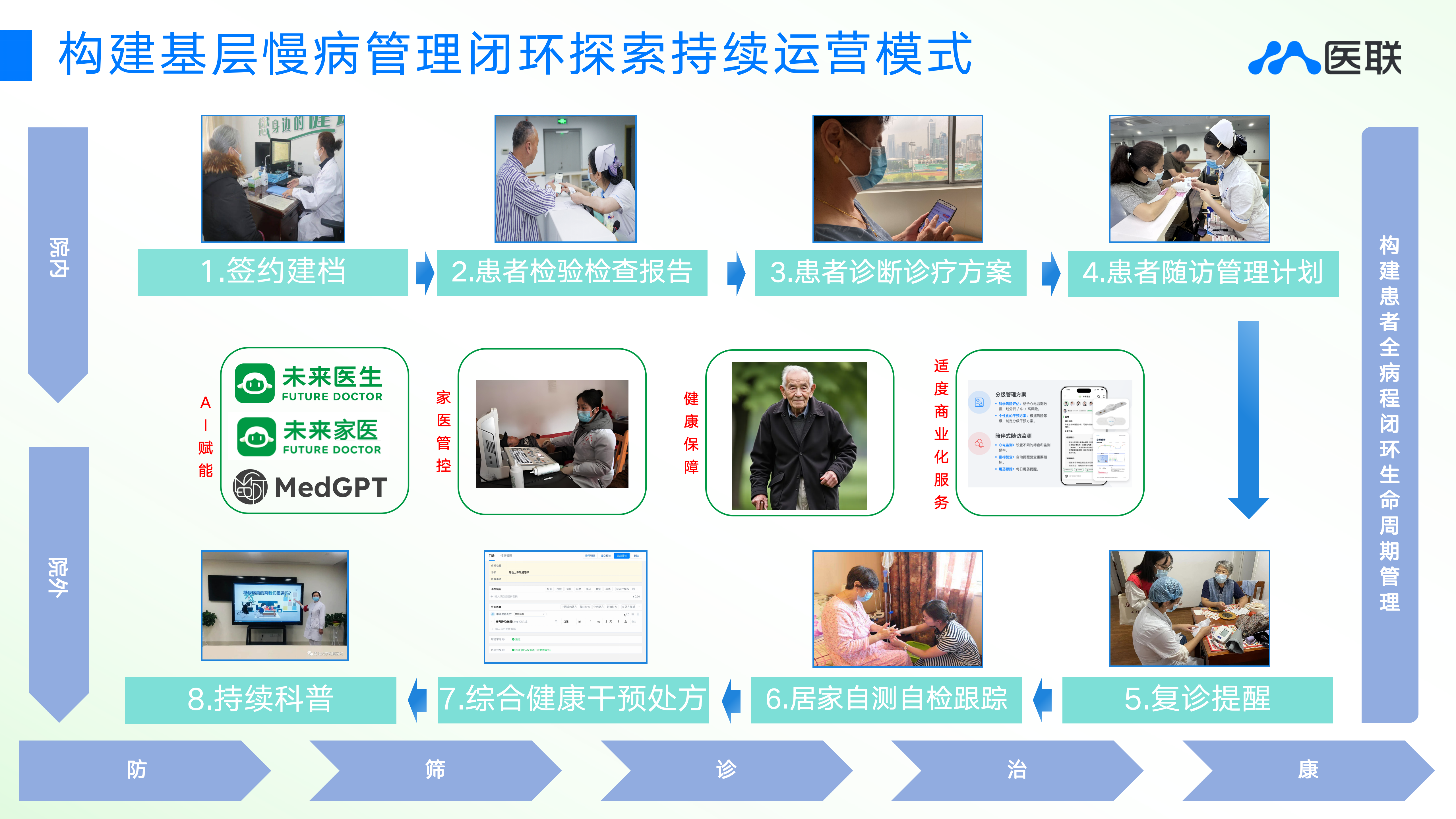 在MedGPT大模型技术优势的强力支撑下,未来医生两年磨一剑,携“未来家医”解决方案闪亮登场。这是一套融合卫健社康和基层医疗体系的多智能体解决方案,覆盖家医签约、智能随访、智能问诊、智能辅诊和慢病管理等基层医疗全场景。