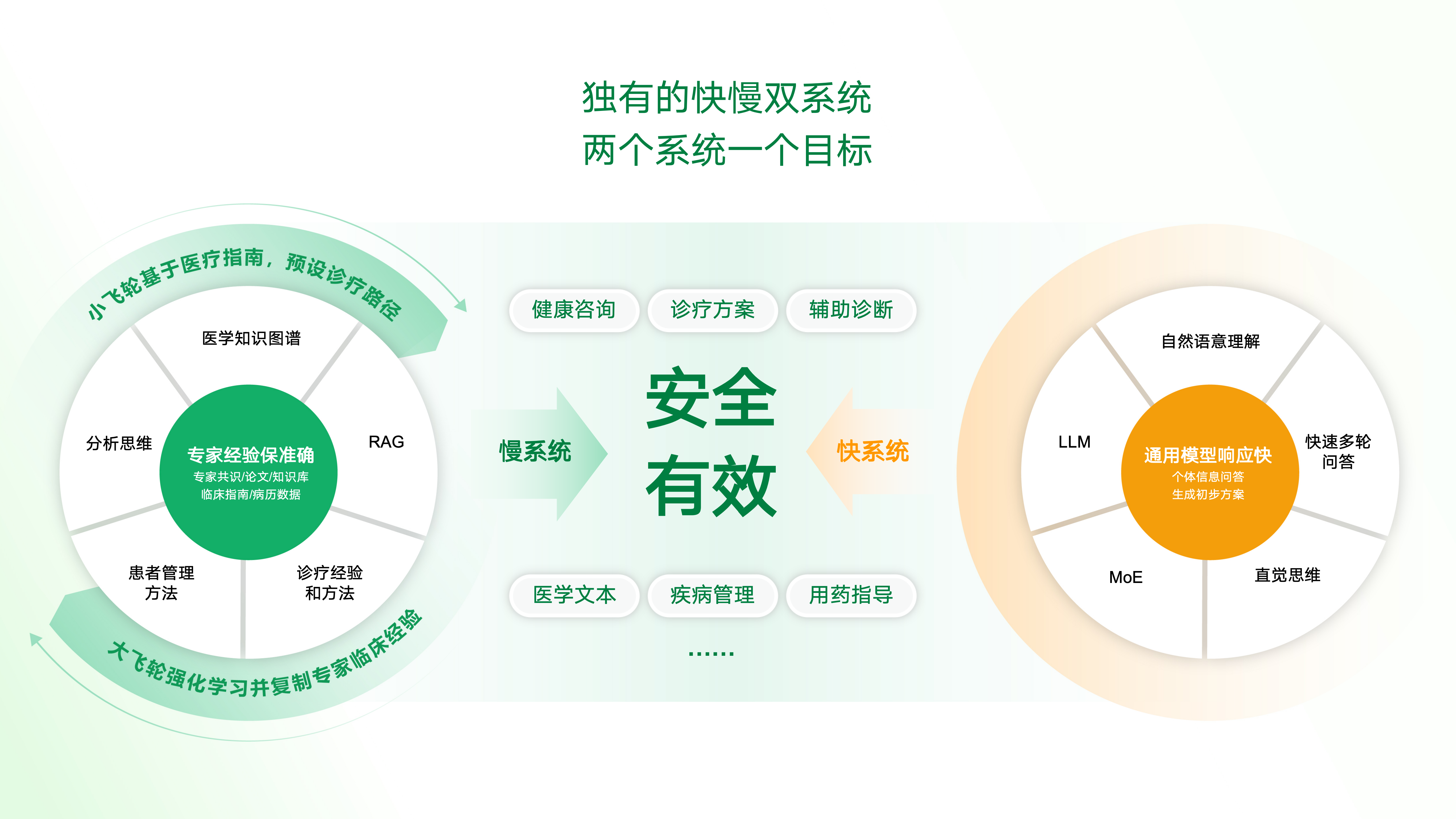 “双飞轮”数据联动机制则确保了AI诊疗的准确性和实用性。“小飞轮”基于医疗指南构建底层算法的预设逻辑,提供标准化诊疗路径,确保准确性和一致性;“大飞轮”通过强化学习复制专家临床经验,定制专家智能分身,实现诊疗方案的个性化和实用性。