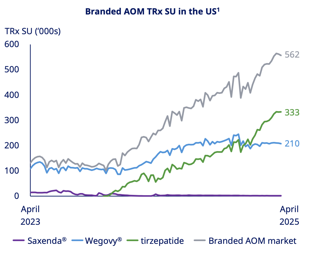 在中国市场的医保准入和产能扩张,以及减重、呼吸暂停等新适应症的加持下,替尔泊肽在 2025 年下半年实现反超,最终以 5 亿美元的差距,微弱领先——司美格鲁肽又差了一点点。
