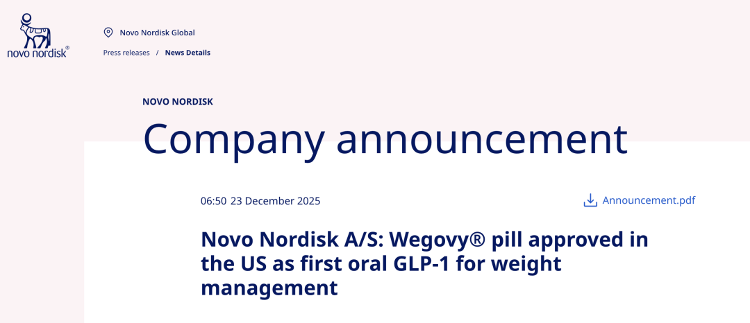 2025 年 12 月 22 日,口服减重版司美格鲁肽在美国获批,成为全球首款口服 GLP-1 肥胖治疗药物,2026 年 1 月正式上市,开年便迎来爆卖:截至 1 月底,在美国的每周总处方量已达约 5 万张。[6,7]