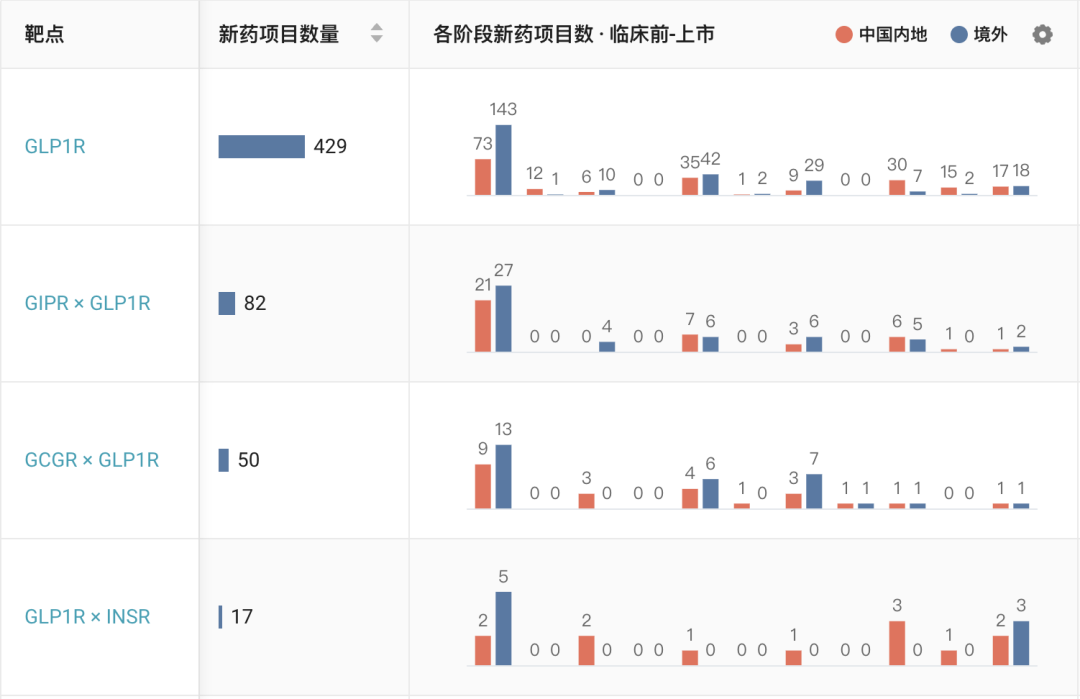 与 GLP-1 靶点相关的项目数(不完全展示)