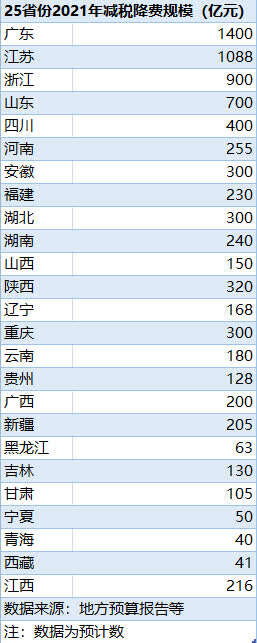 第一财经梳理各地预算报告发现,目前已经有25个省份公布了去年全年的减税降费数据。其中,广东以新增超1400亿元减税降费规模稳居榜首,江苏以1088亿元位居第二;浙江减税降费规模预计超过900亿元;北京虽然尚未披露全年数据,但前三季度减税降费规模约782亿元;山东减税降费规模超过700亿元,四川这一数字约400亿元。
