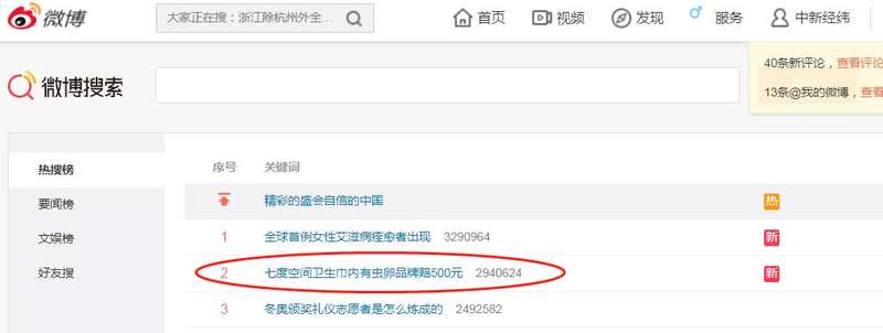 中新经纬2月17日电 17日午后,话题“七度空间卫生巾内有虫卵品牌赔500元”登上新浪微博热搜第二名,七度空间官方旗舰店客服回应称,“(涉事消费者)系其他渠道购买,集团已在紧急处理。”
