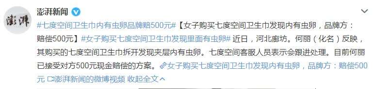 就“七度空间卫生巾内有虫卵品牌赔500元”一事,七度空间官方旗舰店客服表示,“集团已经在紧急处理”,请消费者耐心等待后续处理结果。