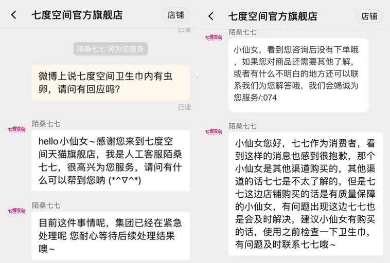 该名客服还透露,“那个小仙女(指涉事消费者)是其他渠道购买的,不太了解。七度空间官方旗舰店购买的话是有质量保障的,有问题这边会及时解决。有购买的话,建议使用之前检查一下卫生巾,有问题及时联系客服。”