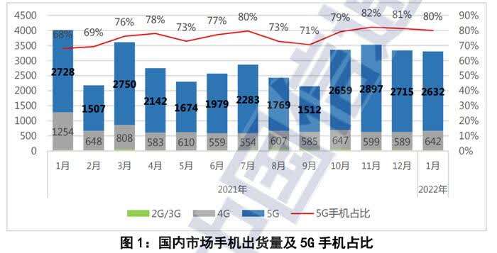 据中国信通院最新数据显示,2022年1月,国内市场手机出货量3302.2万部,同比下降17.7%。其中5G手机2632.4万部,同比下降3.5%,占同期手机出货量的79.7%。