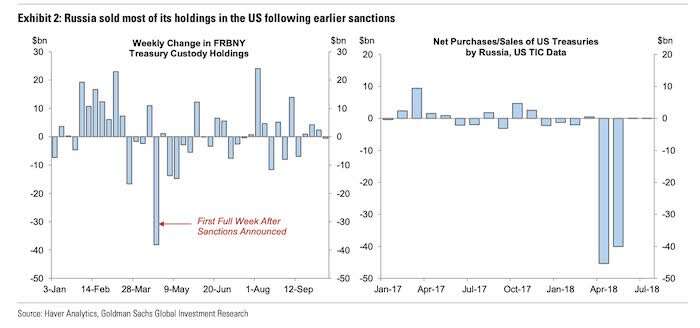 据高盛研究,就地理位置而言,俄央行大部分货币(非黄金)储备在中国(18%)、法国(16%)、日本(13%)和德国(12%)。尽管确切位置难料,但根据俄央行和其他国际消息来源的披露,资金可能从纽约联储的托管账户转移到了欧洲、中国和日本。例如,2018年的春天,俄央行显著减少在纽约联邦储备银行托管的资产。当时的俄央行报告称,其对美国的地理敞口(定义为“按交易对手或证券发行者的居住地分列”)大幅下降。