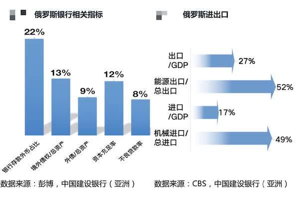 第一财经记者整理数据显示,俄罗斯银行的外币存款占存款总额逾20%,境外债务占总资产9%,境外债权占总资产13%。建行的研究显示,当美欧国家对俄罗斯银行发起制裁,冻结其海外资产,限制其他国家与俄罗斯银行进行业务往来,俄罗斯银行的资产负债表将面临较大的收缩风险以及资产损失风险。俄罗斯银行资本充足率(12%)较低,不良贷款率(8%)较高,美欧制裁将使俄罗斯银行陷入雪上加霜的困境。
