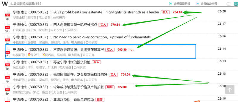 今年1月29日、2月14日,东吴证券发表了两篇宁德时代研究报告并认为电动化趋势明确,国内锂电龙头崛起,继续全面看多电动车龙头,给予“宁王”目标价905.8元,这是去年以来各券商给出的最高目标价。其中,一篇标题为《不畏浮云遮望眼,只缘身在最高层》在Wind研报平台被打上“hot”标签。