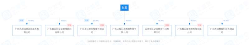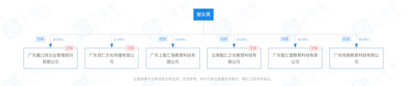 企查查信息显示,广东上智汇海教育科技有限公司持股60%的股东是邹女英,持股40%的股东是付昱。两人此前以同样股比持股的广东智汇盟教育科技有限公司已经被注销,该公司在注销前被广州市番禺区市场监督管理局予以20万元的处罚,处罚事由是“公平交易违法行为,广告违法行为”――2019年7月29日,广州市番禺区市场监督管理局法人员依法检查,发现当事人在经营场所张挂“智汇盟发展历程”的宣传海报中有“2018年3月一周年,达成10万学员,平台估值4亿2018年12月全球股交挂牌,启动上市战略2019年3月两周年,平台达成24万学员,平台估值15亿”等字样宣传海报的行为,违反《中华人民共和国广告法》相关规定。