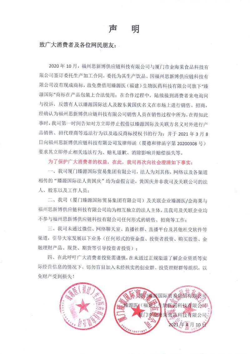 声明进一步指出:“我司厦门臻源国际贸易集团有限公司,法人为刘其伟,网络以及各渠道相传的‘臻源国际法人黄国庆’均为虚假言论,黄国庆并非我司及关联公司的法人、股东以及工作人员;我司(厦门臻源国际贸易集团有限公司)及关联企业臻源医/金海莱与福州思新博供应链科技有限公司均为相互独立的法人主体,且我司及关联企业均不参与福州思新博供应链科技有限公司任何形式的销售、招商等工作;我司未通过微信、网络聊天室、直播社群、直播平台及其他社交软件等渠道,引导大家发展以下业务(任何形式的资金盘、投资者投资、购买股票、金融理财产品、现货、期货等引导投资者投资)。”