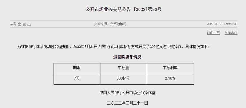 中新财经3月21日电 3月21日,为维护银行体系流动性合理充裕,人民银行以利率招标方式开展了300亿元7天期逆回购操作,中标利率为2.10%。(完)