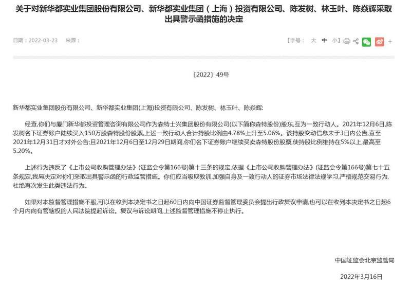 3月23日,北京证监局发布消息称,陈发树和其一致行动人违规举牌森特股份。经查,华都实业集团股份有限公司、新华都实业集团(上海)投资有限公司、陈发树、林玉叶、陈焱辉与厦门新华都投资管理咨询有限公司作为森特股份股东,互为一致行动人。