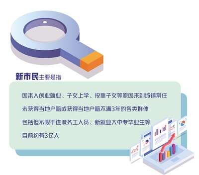 随着我国工业化、城镇化和农业现代化进程的深入推进,数以亿计农村人口通过就业、就学等方式转入城镇,融入当地成为新市民。《通知》提出,新市民主要是指因本人创业就业、子女上学、投靠子女等原因来到城镇常住,未获得当地户籍或获得当地户籍不满3年的各类群体,包括但不限于进城务工人员、新就业大中专毕业生等,目前约有3亿人。