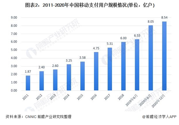 支付企业在移动支付的全面布局,也带动了手机在线支付用户的增长。2011-2020年,我国移动支付用户规模逐年增长,中国互联网络信息中心发布的第47次《中国互联网络发展状况统计报告》数据显示,截至2020年12月,我国移动支付用户规模达到8.54亿,比2019年6月增长了34.9%,网民移动支付的使用比例由2018年底的72.5%提升至86.4%。