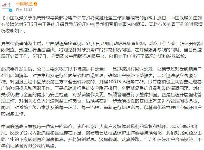 中新财经5月11日电 针对6日因系统升级导致部分联通用户被异常扣费相关事宜,中国联通官方微博日前发布声明称,中国联通已于5月6日立即启动应急处置机制,深入开展细致调查,迅速进行全面整改。