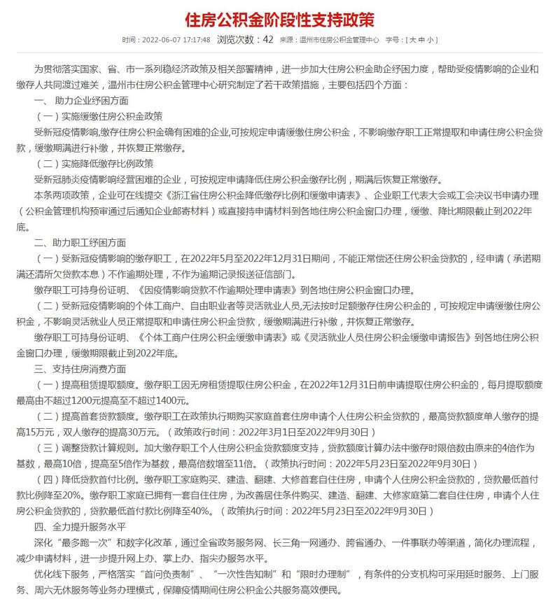 6月7日,温州市住房公积金管理中心发布《住房公积金阶段性支持政策》(下称《政策》),其中明确缴存职工家庭购买、建造、翻建、大修首套自住住房,住房公积金贷款最低首付款比例降至20%。