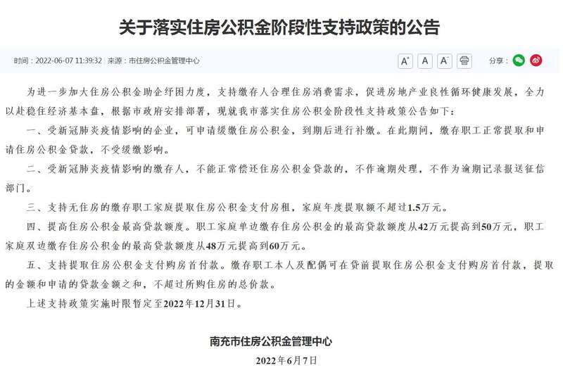 同样是在6月7日,南充市住房公积金管理中心发布《关于落实住房公积金阶段性支持政策的公告》(下称《公告》),其中明确,支持提取住房公积金支付购房首付款,实施时限暂定至2022年12月31日。