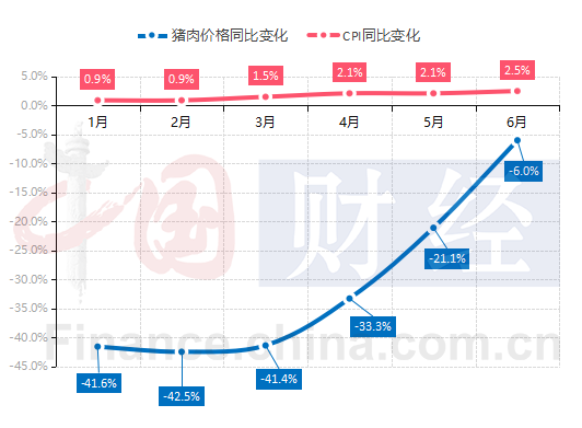 国家统计局数据显示,今年6月份全国CPI(居民消费价格指数)同比上涨2.5%,涨幅比上月扩大0.4个百分点。其中,猪肉价格同比下降6.0%,降幅比上月收窄15.1个百分点,并且是连续第4个月降幅收窄。