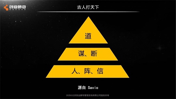因此必须拥抱企业经营的确定性,用系统化的思维去建设组织。今天我将通过古人打天下、今人打天下和个人打天下三个维度来分析该如何打天下,从而帮助我们找到确定感。
