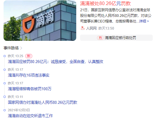 在滴滴受到监察,APP下架了一年之后,7月21日,国家互联网信息办公室依据《网络安全法》、《数据安全法》、《个人信息保护法》、《行政处罚法》等法律法规,对滴滴处以人民币80.26亿元罚款,对滴滴董事长兼CEO程维、总裁柳青各处人民币100万元罚款。