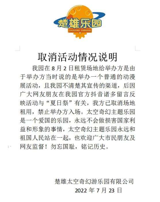 7月23日,楚雄一主题乐园发布声明称:我园在8月2日租赁场地给举办方是由于举办方当时说的是举办一个普通的动漫展活动,且我园不清楚其宣传的渠道,后因广大网友朋友在我园官方抖音诸多留言反映活动与“夏日祭”有关,我方已取消场地租用,禁止举办方入场。
