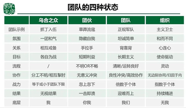 管理者要建什么样的团队?恰好手中有这样一张表,咱们可以对照一下,看看咱们的是真正的团队,还只是一种团伙的状态?