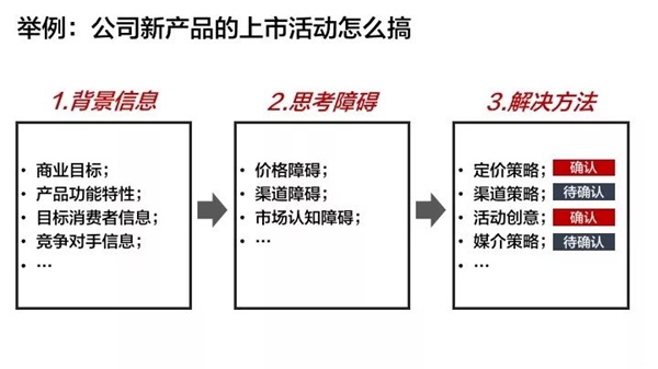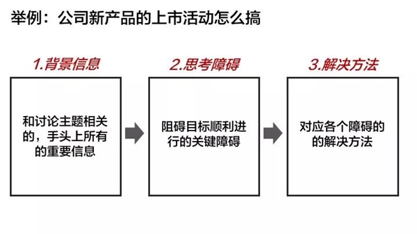 拿上面的情景来举例,会议的最初目标是讨论出“公司新产品的上市活动应该怎么搞”,那么就意味着需要得出这次活动的策划主题和活动框架。所有思考都要紧紧围绕着这个目标,不能发生偏移。