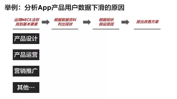 当老板要你分析公司App 产品用户数据下滑的原因时,首先不应该去搜集事实、数据或资料,而是向经验丰富的前辈请教导致用户数据下滑的可能因素有哪些(运用MECE法则,保证这些因素互相之间不干扰,不重复,彼此完全独立),然后把它们画在纸上,一步步形成你的分析框架,例如下图: