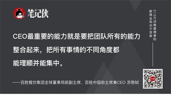 裴亮:所谓“内行看门道,外行看热闹”,我介于两者之间。从苏总个人的风格和他管理百胜集团这些年的成绩,我总结有两个方面的逻辑:“道”和“术”的层面。