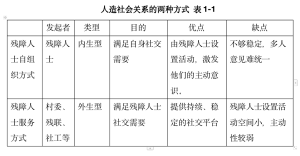 两种方式各有特点:第一种方式属于内生型,由残障人士自发组织,出自该群体内生的共同社交需要。其优点是残障人士可以从自身实际出发,发起适合自身实际情况和需求的社交活动,主动建立社交关系。缺点是如若缺少主要核心人物的组织或组织发展到一定规模,容易出现组织成员意见难以统一,组织难以为继的状况。第二种方式是外生型,由外力推动建立起来的关联再造。其优点是可以通过机构和专业人员的支持,建立起持续、稳定的社交平台和网络,缺点是残障人士大多时候没有设置活动的空间,且运作成本较高。