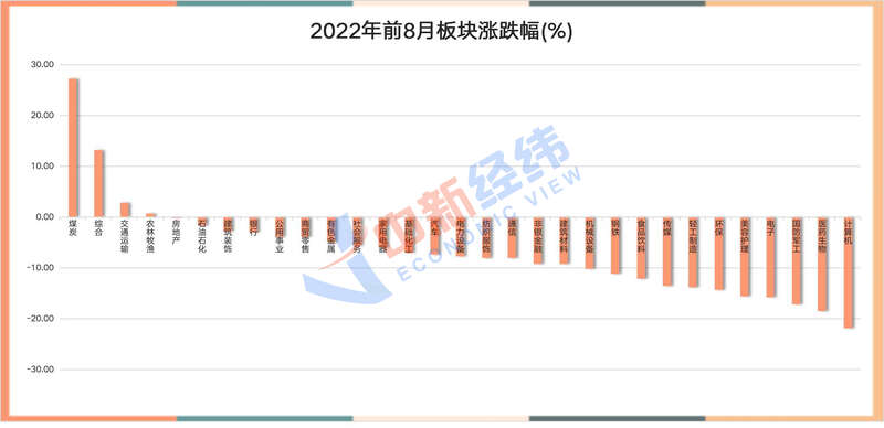 从板块来看,申万31个行业中,有27个以下跌结束前8月,计算机、医药生物、国防军工、电子、轻工制造、传媒、食品饮料等行业领跌,煤炭行业则以涨超20%领涨两市。