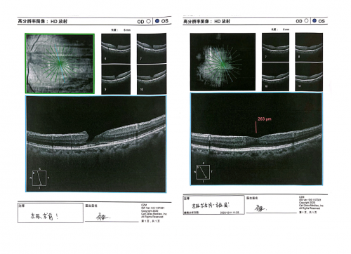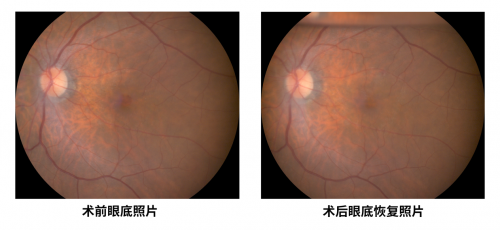 术后第五天,黄先生准时从香港来到深圳复查。眼底照相、光学相干断层扫描的影像上,除了眼球腔内上方还残余少部分气体外,看不到任何手术痕迹。濒临全层破裂的黄斑裂孔,也已完美闭合,图像上看好像不曾病变过!