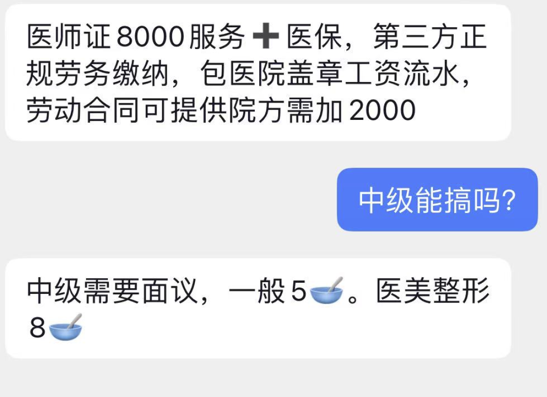 但想要做到尽善尽美,价格就会不菲,「一套下来最低 8000 元,还不保证 100% 通过,一旦被查概不退款。」这位中介还表示,中级职称考试的资格也可以搞定,但需要收费 5 万元左右,医美等特殊领域则需要 8 万元。