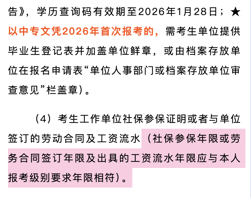 当然,还有更严格的地区规定。比如资阳市在公告中就要求,社保参保年限或劳务合同签订年限及出具的工资流水年限,应与本人报考级别要求年限完全相符。